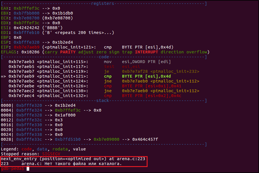 Но не смотря на это таким способом можно было бы перезаписать EIP и даже выполнить шелл-код, но нам просто повезло с размером массива, и так работать будет не всегда. Поэтому поищем более аккуратный путь для эксплуатации.
