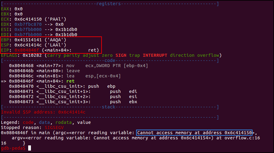 Второе: перезапись ESP привела к тому, что теперь EIP указывает на несуществующее значение, ведь ret попытался перейти по адресу 0x6c414150 (выделено синим). За это ответственна инструкция push DWORD PTR [ecx-0x4] из пролога, где ecx-0x4 = (esp+0x4)-0x4 = 0x6c414150.