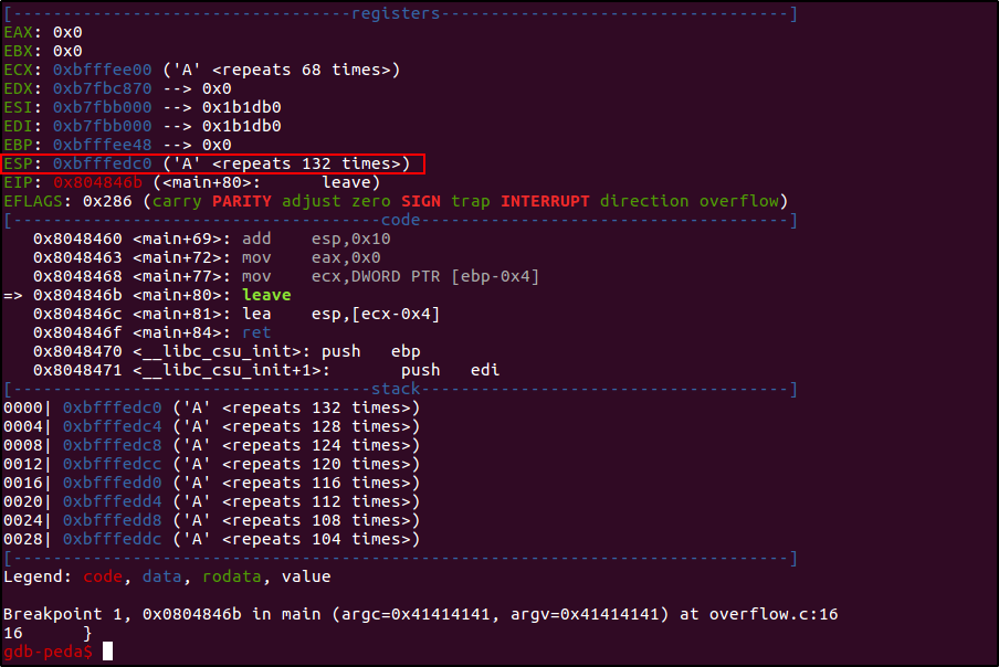 Здесь все немного не так очевидно, но все равно вполне объяснимо: когда я передаю паттерн длиной 132 байта, на самом деле, я передаю не 132 байта, а 133, ведь добавляется вездесущий нуль-терминатор или символ конца строки (ведь мы пишем на Си). Поэтому 132 байта «официально» принял массив buf, а вот нулевой символ достался LSB-байту значения в ECX, что понижает его на два разряда или, что то же самое, делит на 256. Следовательно, ESP (а значит и EIP) впоследствии окажется «внутри» buf, так как его адрес значительно уменьшится.