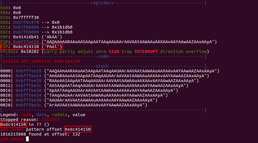 Первое: перезапись ECX привела к тому, что в регистр ESP попало значение 0x6c41414c ('LAAl'), а это ничто иное, как 0x6c414150 - 4, где 0x6c414150 — это последовательность PAAl, которая присутствует в сгенерированном паттерне, начиная с 133 позиции. За это ответственна инструкция lea esp,[ecx-0x4] из эпилога.