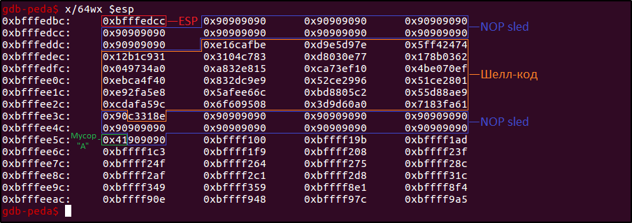 Таким образом, разметить шелл-код я должен по тому же адресу, который содержит сохраненное значение регистра ESP. Если учесть еще два 32-байтных NOP-среза, в которые я облачу полезную нагрузку, и тот факт, что «прыгнуть» я собираюсь ровно на середину первой NOP-последовательности (0xbfffedd4 = 0xbfffedc4 + 16), то конечный вид эксплоита будет выглядеть так.