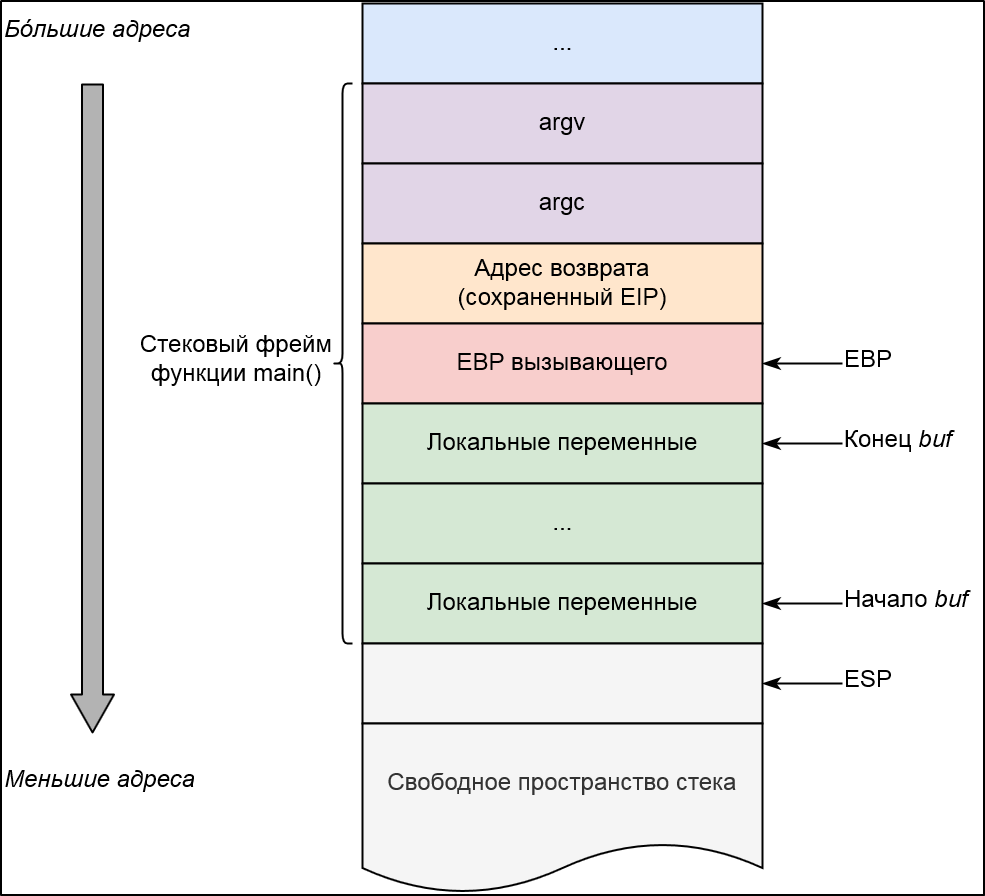 Вспомним картинку, которую рисовали каждому юному девелоперу, демонстрирующую расположение данных в стеке. Для конкретики возьмем наш заведомо уязвимый исходник.