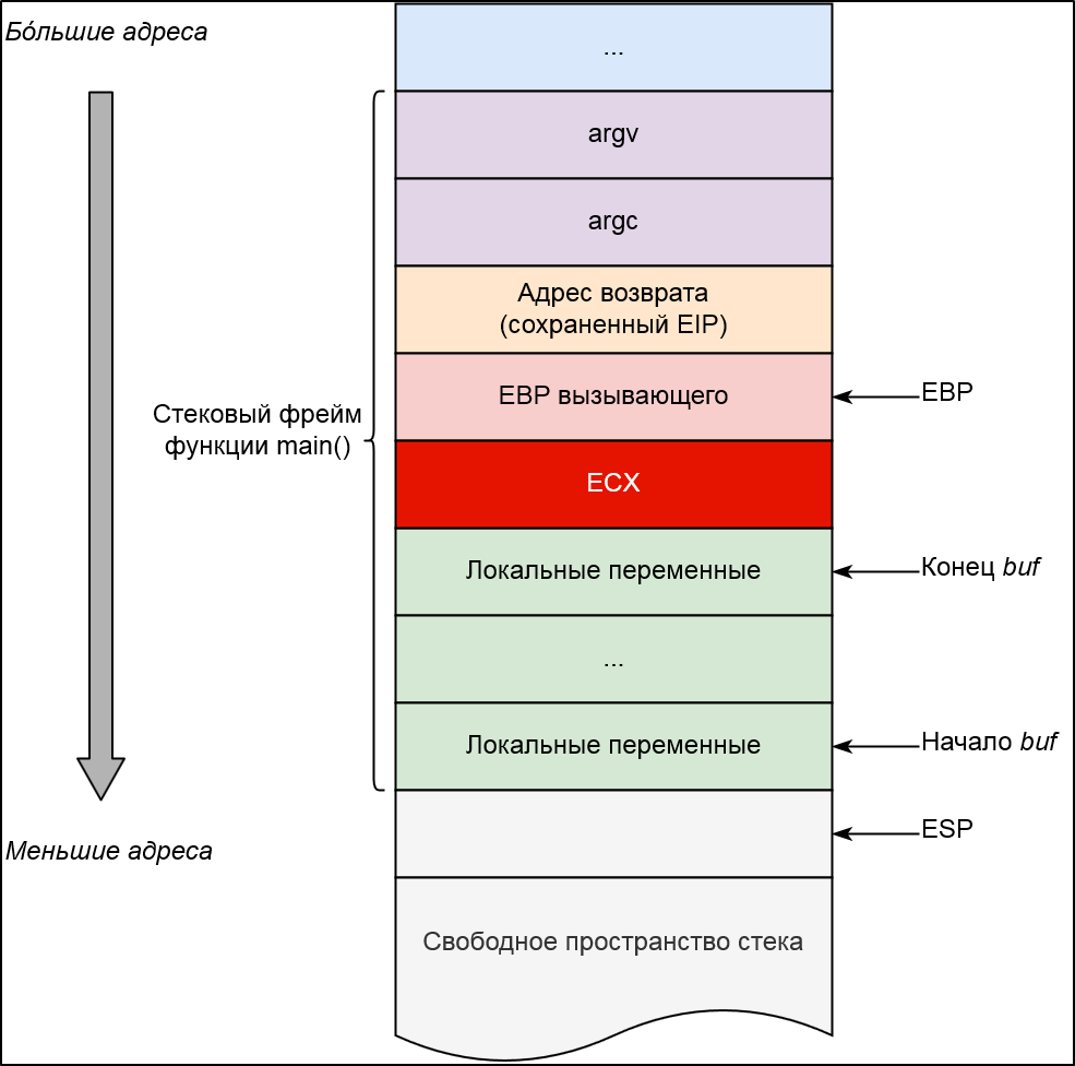 Два важных регистра процессора, которые участвуют в формировании стекового кадра, — это ESP и EBP.