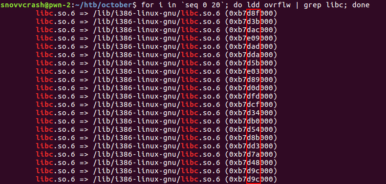 Активируем ASLR и взглянем на то, как меняются адреса загрузки libc, снова выполнив скрипт ldd в цикле.