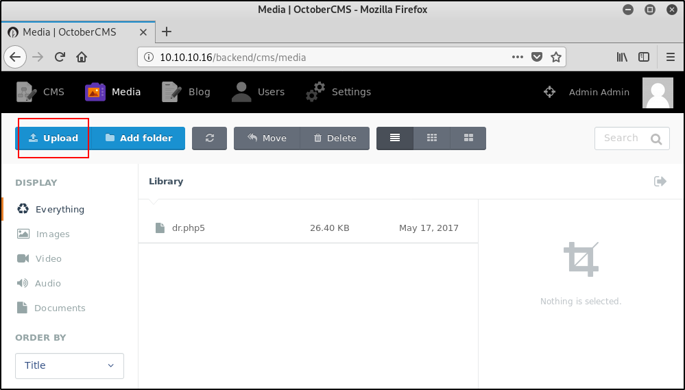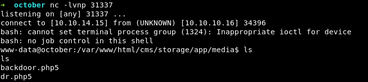 Вопросив searchsploit о существующих уязвимостях October CMS, я нашел способ загрузки веб-шелла — виной был неполный черный список расширений потенциально уязвимых файлов, в котором отсутствовало упоминание об php5.
