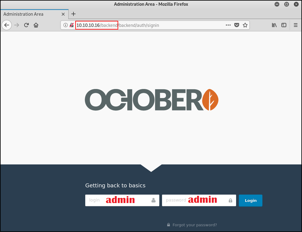 October — относительно несложная виртуальная машина с Hack The Box, однако на ее примере удобнее всего разобрать, что, в сущности, из себя представляют: атака ret2libc, применяемая для обхода запрета выполнения данных (DEP/NX-Bit) в стеке; и подбор необходимого адреса той самой стандартной разделяемой библиотеки libc для нивелирования рандомизации размещения адресного пространства (ASLR). Ко всему прочему, на общий уровень сложности повлиял челлендж с захватом админки CMS, где случайно оставили дефолтную авторизацию, поэтому быстро пробежим вступление и более подробно остановимся на этапе privilege escalation.