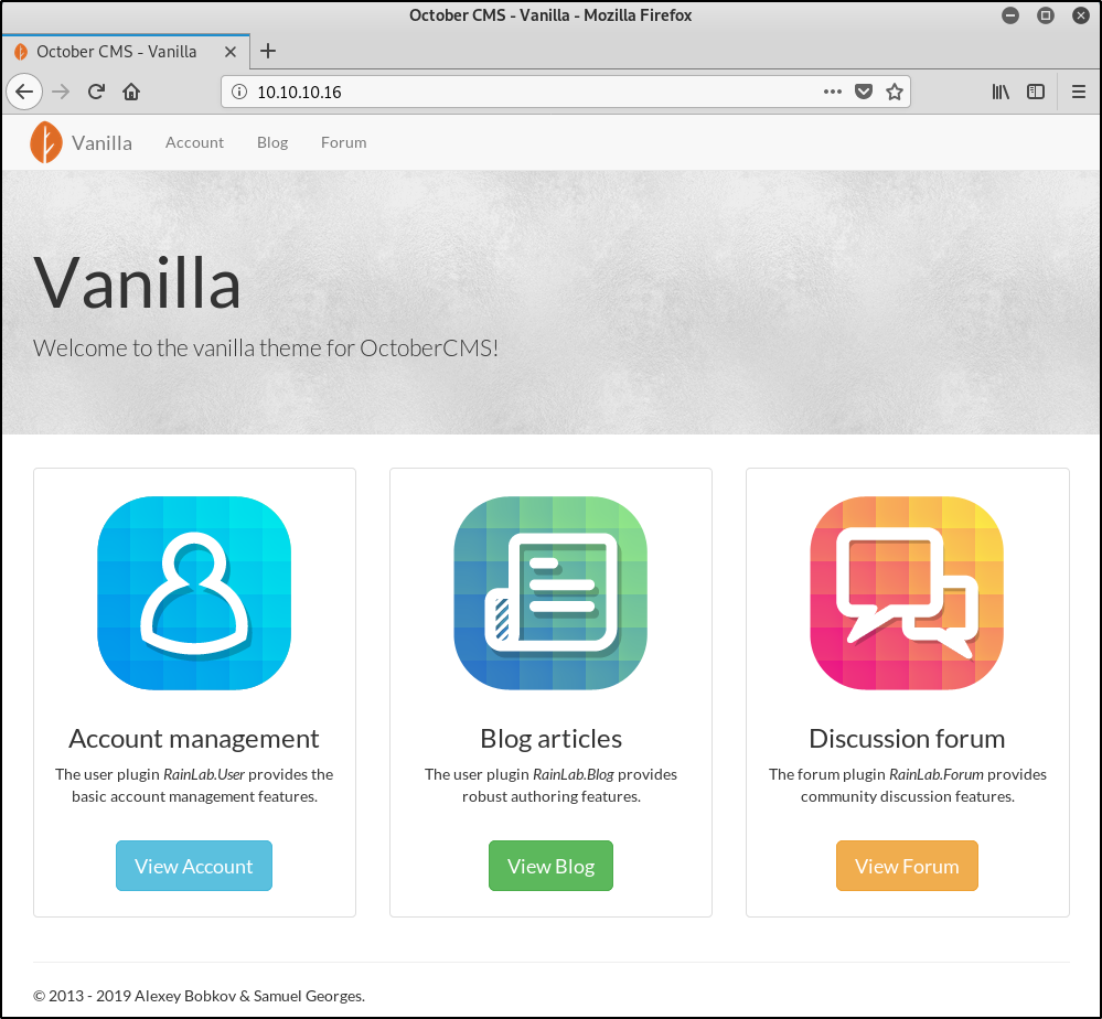 На http://10.10.10.16:80 тебя встретит сервер Apache с системой управления содержимым October CMS (тема — Vanilla).
