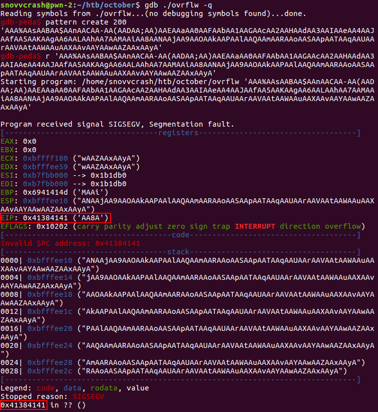 Я сгенерирую и передам уникальный паттерн из 200 байт, а после расчитаю точку перезаписи адреса возврата по текущему значению регистра EIP.