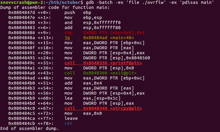 Альтернативным подходом к получению адресов требуемых функций является использование команды print отладчика GDB. Загрузив ovrflw для отладки, аналогично просмотру маппинга памяти выставим точку останова на main, запустим программу и вытащим нужные нам адреса.