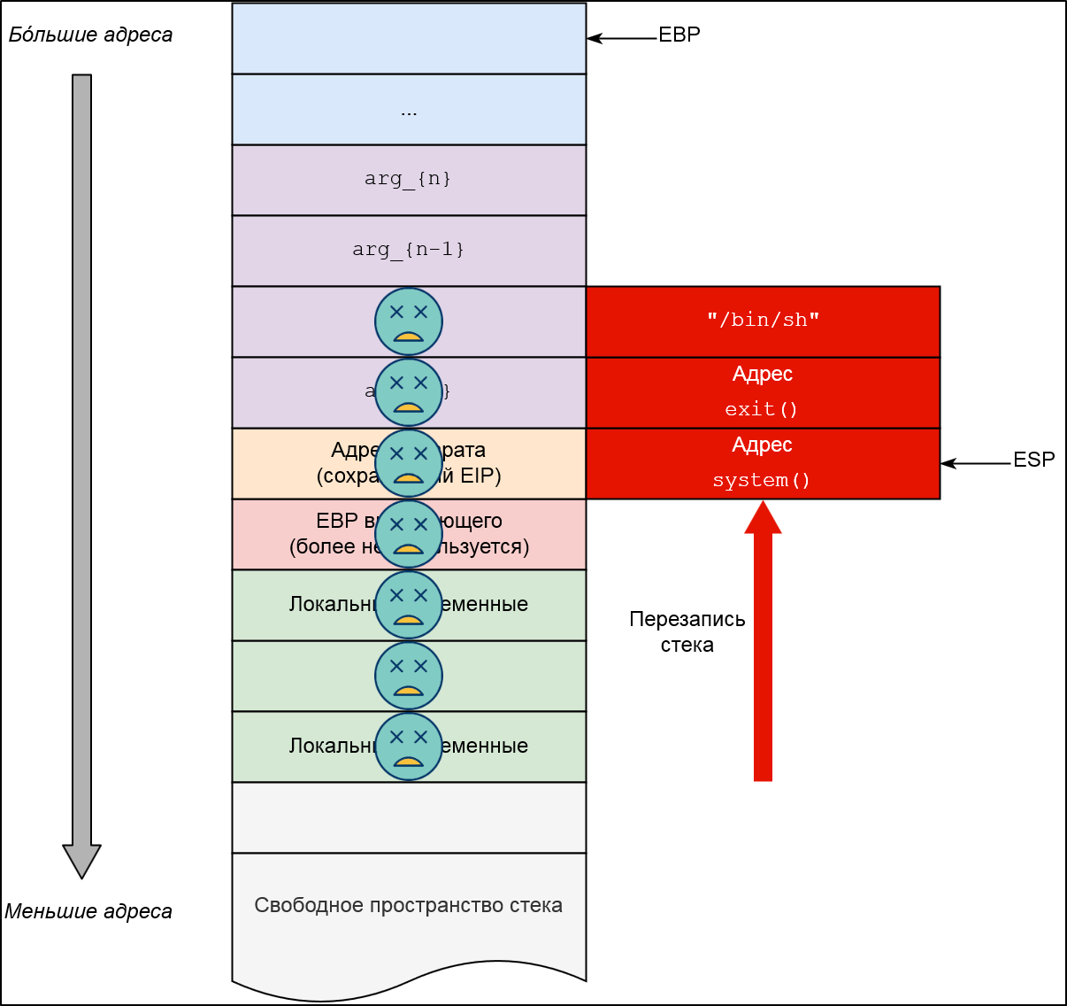 callи разместили квази-адрес-возврата (который в сущности является адресом функцииexit); - перезаписали оригинальное сохраненное значение EIP адресом функции