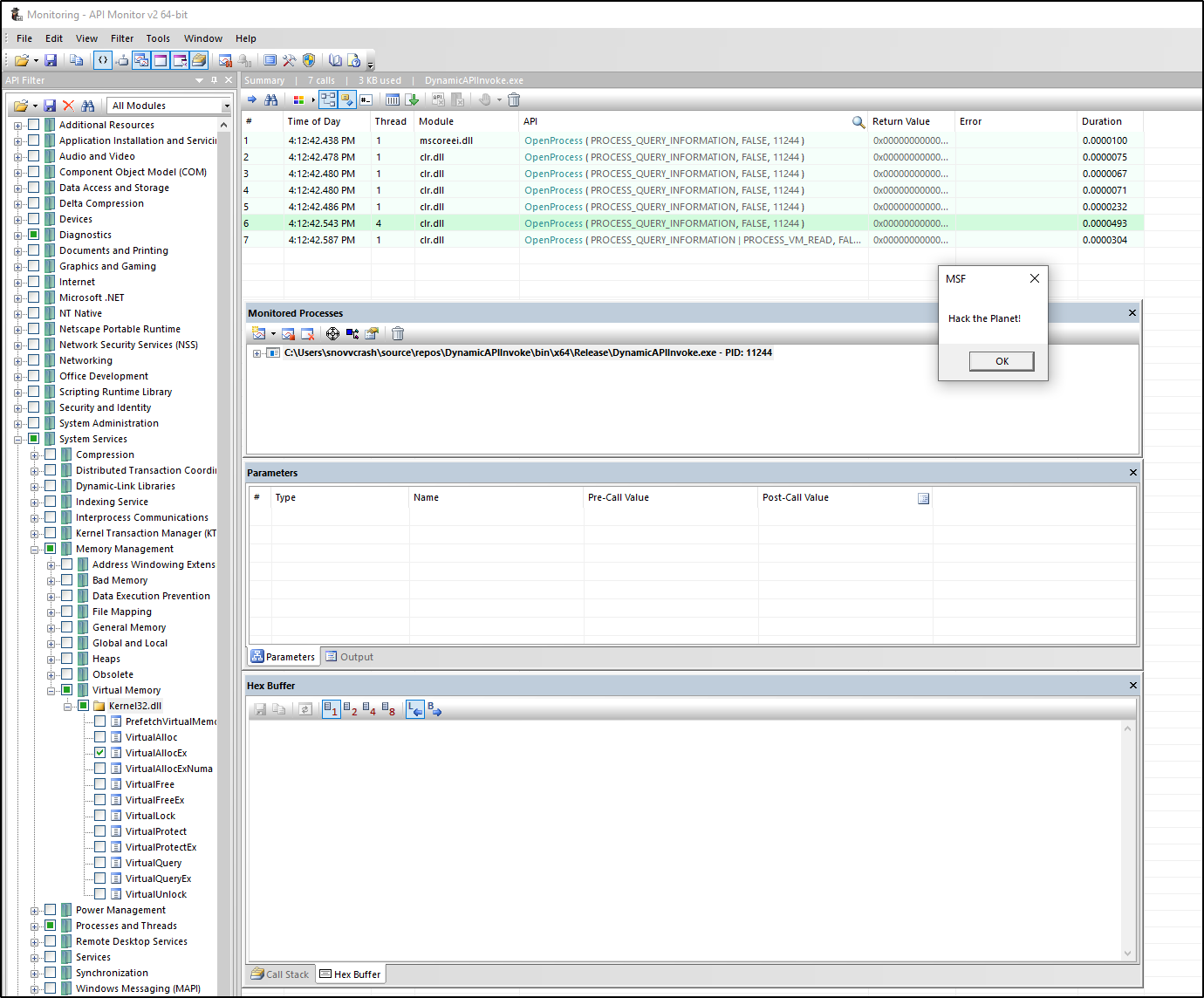 // msfvenom -p windows/x64/messagebox TITLE='MSF' TEXT='Hack the Planet!' EXITFUNC=thread -f csharp
