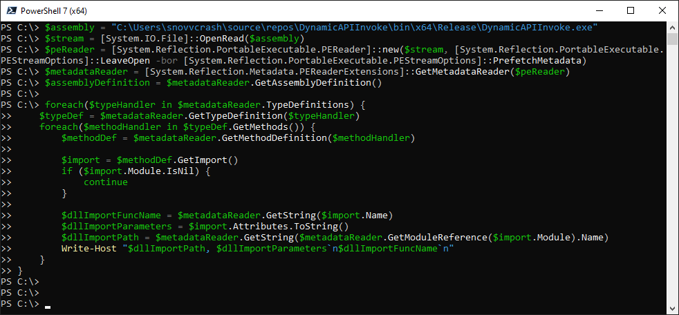 $dllImportFuncName = $metadataReader.GetString($import.Name)