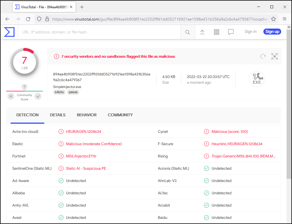 Если просто положить такой бинарь на диск с активным средством антивирусной защиты, реакция будет незамедлительной независимо от содержимого массива buf, то есть нашего шеллкода. Все дело в комбинации потенциально опасных вызовов Win32 API, которые заведомо используются в большом количестве зловредов. Для демонстрации я перекомпилирую инжектор с пустым массивом buf и залью результат на VirusTotal. Реакция ресурса говорит сама за себя.