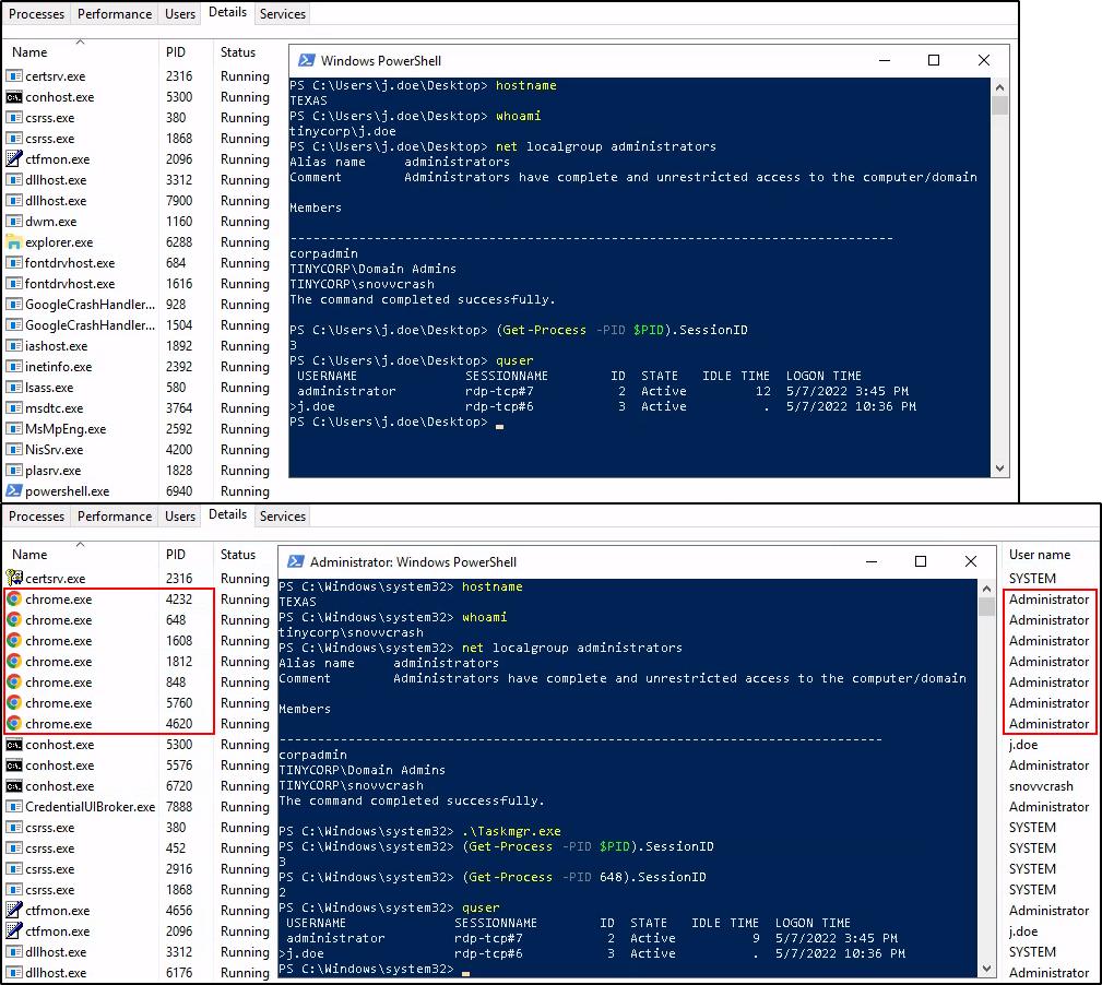 Наглядный пример: пользователь TINYCORP\j.doe в моей лабе не имеет прав локаладмина на сервере TEXAS, поэтому не может видеть запущенных от имени администратора процессов Google Chrome, будучи подключенным по RDP. Однако, если открыть диспетчер задач с правами администратора, эти процессы будут отображены.